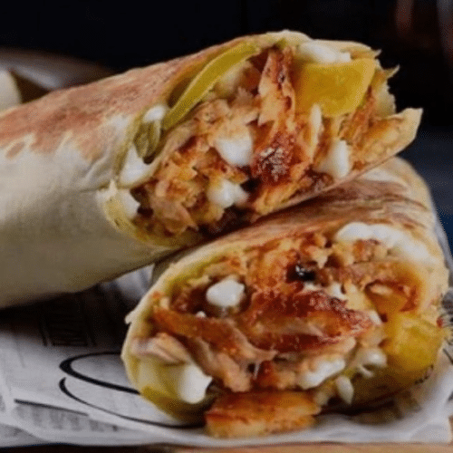 Traditionele kip shoarma wrap in Libanees brood met Syrische knoflooksaus